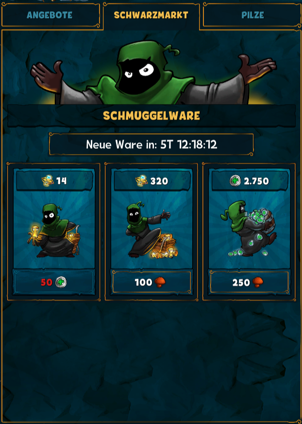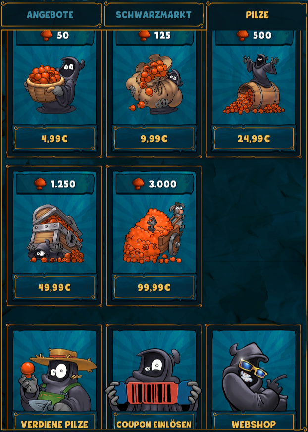 Pilze sind, neben Gold, ein begehrtes Zahlungsmittel. Ist der Vorrat an Pilzen zur Neige gegangen? Kein Problem! Beim Pilzdealer kann man auf verschiedenen Wegen Pilze nachbestellen - dazu nutzt man einfach den "Pilzdealer"-Button in der Navigationsleiste oder klickst auf das Pilzdealer-Icon ganz unten auf dem Bildschirm, während du in der Stadtansicht bist, um den WebShop zu öffnen.