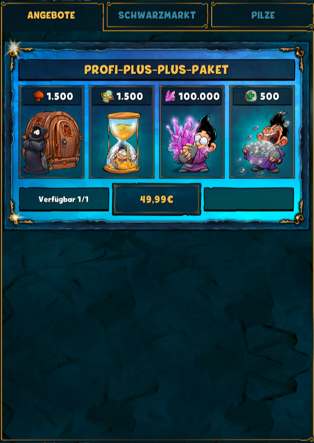 Profi-Plus-Plus-Paket | ab Level 250 | Profi-Pro-Paket muss gekauft worden sein | 1.500 Pilze, 1.500 Treibsanduhren der Ungeduld, 100.000 Arkane Splitter, 500 Lucky Coins |