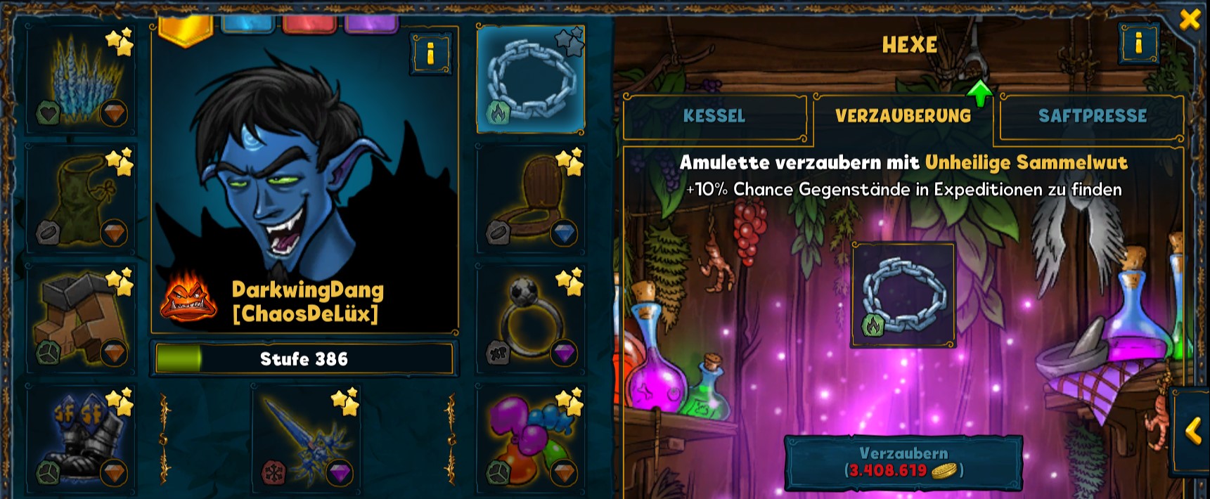 Auch wenn alle Verzauberungen freigeschaltet sind, können weitere Gegenstände in den Kessel geworfen und so der doppelte Verkaufspreis in Gold erhalten werden.
