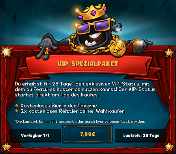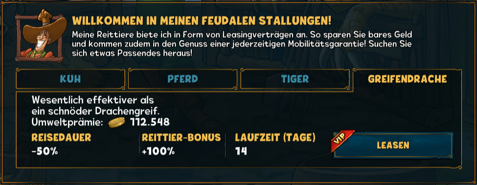 Sofern du während der Dauer des VIP-Status noch keine zwei Reittiere gekauft hast, zeigt ein VIP-Banner auf der Kaufschaltfläche an, dass du ein Reittier kostenlos kaufen kannst.