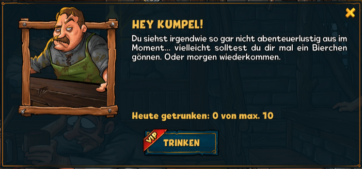 Während dein VIP-Status aktiv ist, kannst du im Schankraum Freibier trinken. Der Trinken-Button zeigt mit einem VIP-Banner an, dass das Bier kostenlos ist.