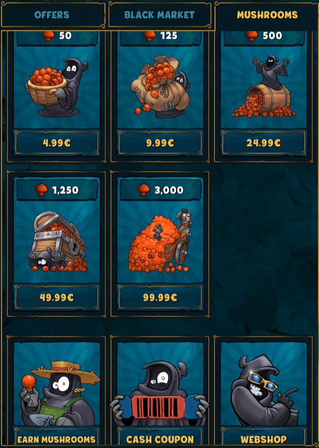 A parte l'oro, i funghi sono la valuta più ricercata. Hai finito i funghi? Non preoccuparti! Puoi ordinarli dal mercante di funghi facendo clic sull'icona "+" in alto a sinistra nella barra di navigazione oppure facendo clic sull'icona del mercante sotto la barra di navigazione per aprire il WebShop.