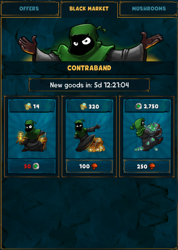 Il mercato nero è una sezione del mercante di funghi e offre articoli in cambio di valute del gioco, come le monete fortunate e i funghi.