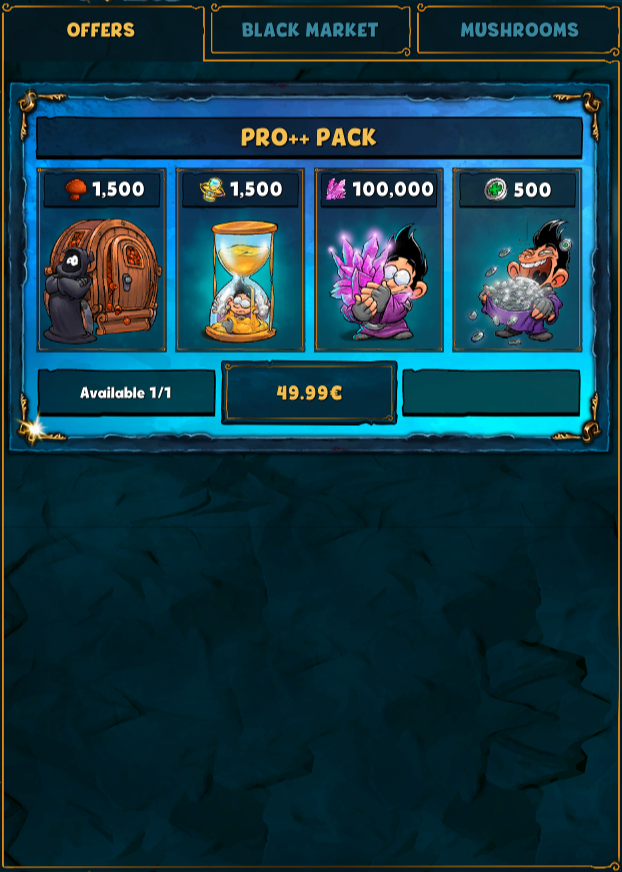 Pack Pro++ | Livello 250+ | Aver acquistato il Pack Pro Pro | 1.500 funghi, 1.500 clessidre, 100.000 frammenti arcani, 500 Monete Fortunate |